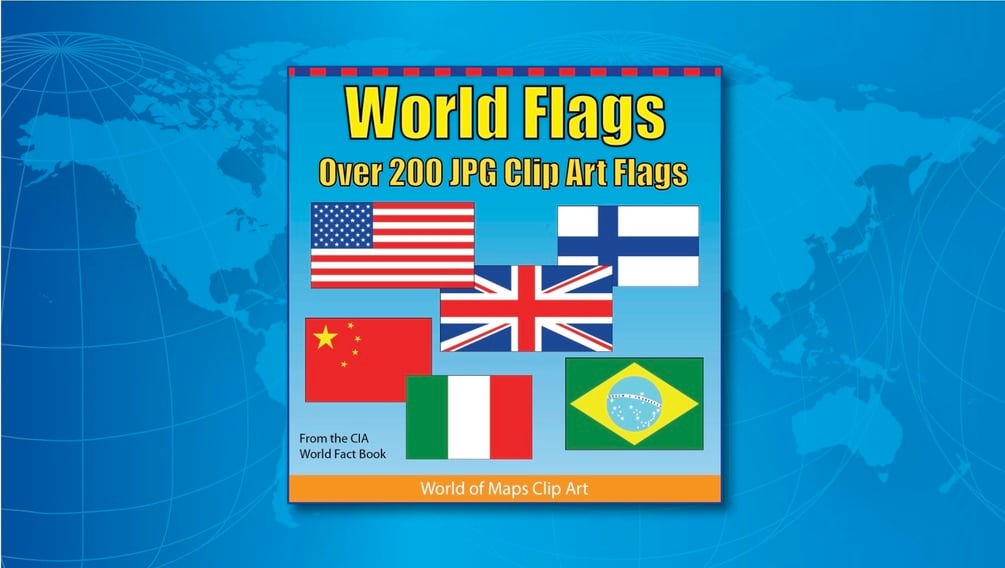 World of Maps Flags Collection, a collection of 250 world country flags in jpg format. Perfect for educational projects, homeschool, and presentations. Includes major, smaller and island nations, countries, and territories from around the world. We start with Afghanistan to Australia, Belize, Bulgaria, Denmark, France, Ireland, Malaysia, New Zealand, Philippines, South Africa, Sweden, the United States, and finishing up with Zimbabwe. About 250 flags in all. Included are several sizes of the United States Flag. The flags are from the CIA World Fact Book collection, are royalty-free and copyright free.
