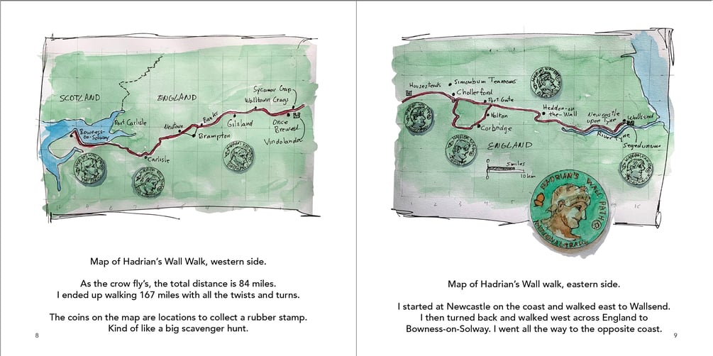 Walking Hadrian’s Wall, Wallsend to Bowness-on-Solway takes you on my walking trek along Hadrian’s Wall and across England in the late summer of 2022. I walked along the famous Hadrian’s Wall built in AD 122 by Emperor Hadrian. Over a period of 10 days, I crossed the country. Starting on the east coast at Wallsend I walked to Bowness-on-Solway on the west coast. The journey has been recreated with watercolor illustrations and daily descriptions of the adventure. Over the 84-mile journey, I met many wonderful people and experienced Roman and English history.